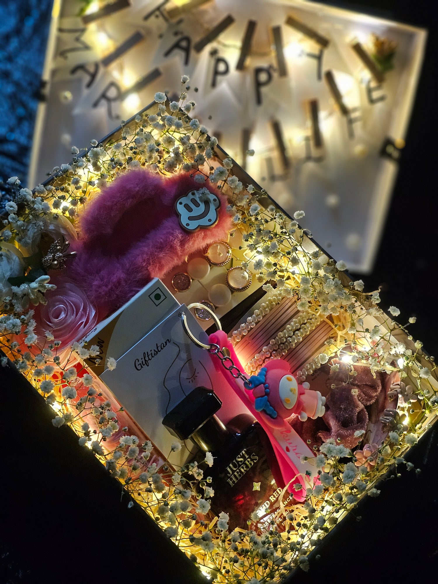Looking for a gift that creates an unforgettable unboxing experience? Our curated gift hampers at Giftistan.store combine beauty, utility, and luxury packaging to become the perfect solution for weddings, birthdays, anniversaries, and corporate gifting across India. Each hamper arrives in an elegant LED-lit gift box filled with premium dried grass base, fairy lights, and carefully selected items including designer for girls such as scrunchies, hair clips, elegant bangles, cute keychains, luxury hand soap bottles, travel-size perfumes, premium chocolates, clutcher bags, and hair pins – all artfully arranged with mini flowers for that Instagram-worthy presentation.